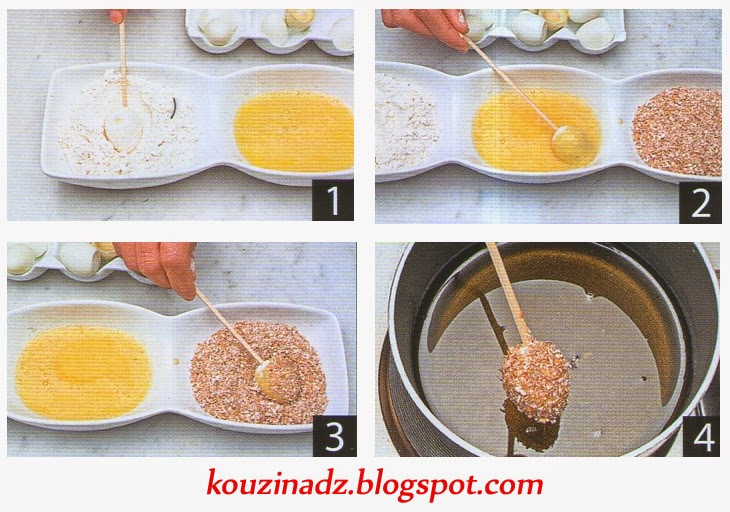 Piquer les œufs durs dans des bâtons en bois, les napper dans la farine.